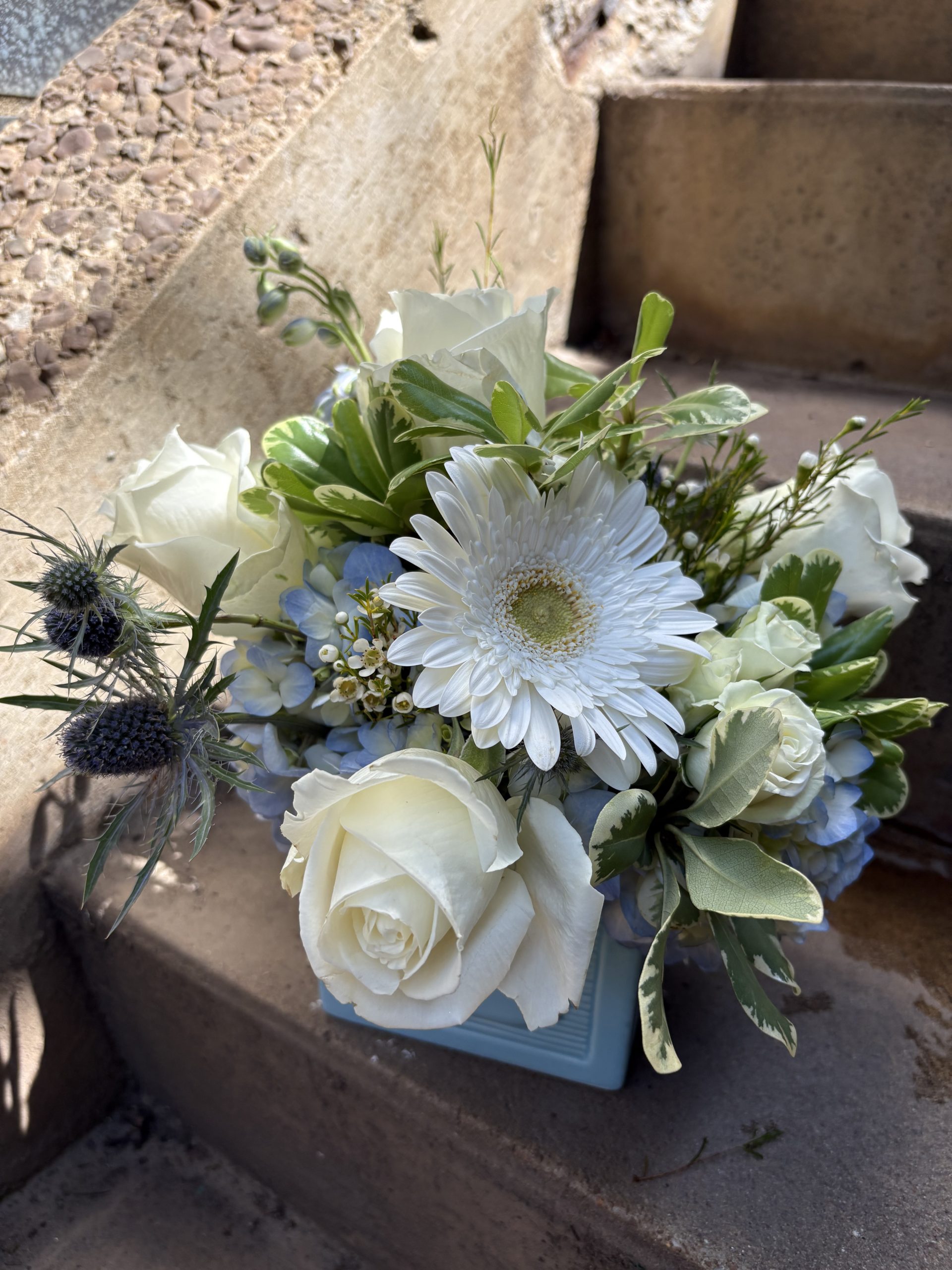 Consists of roses, hydrangea, thistle, wax flower, gerbera daisy, delphinium, and greenery.