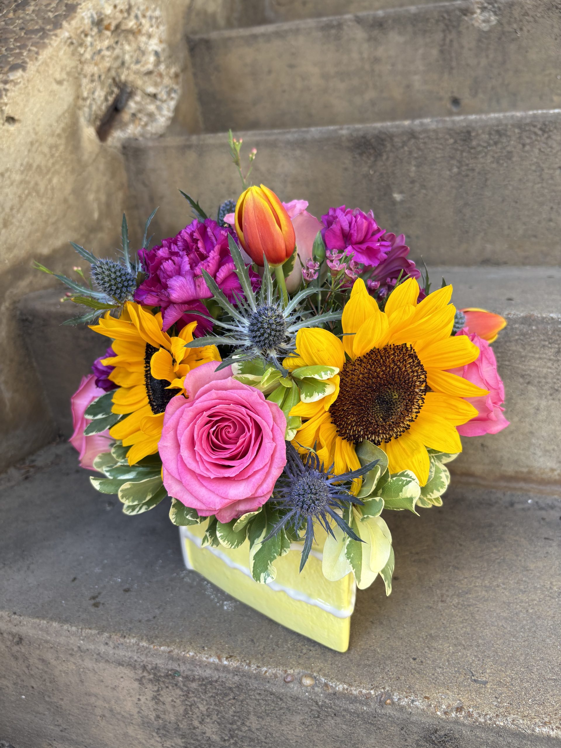 Various flowers arranged in a birthday cake vase! Makes a great keepsake gift.