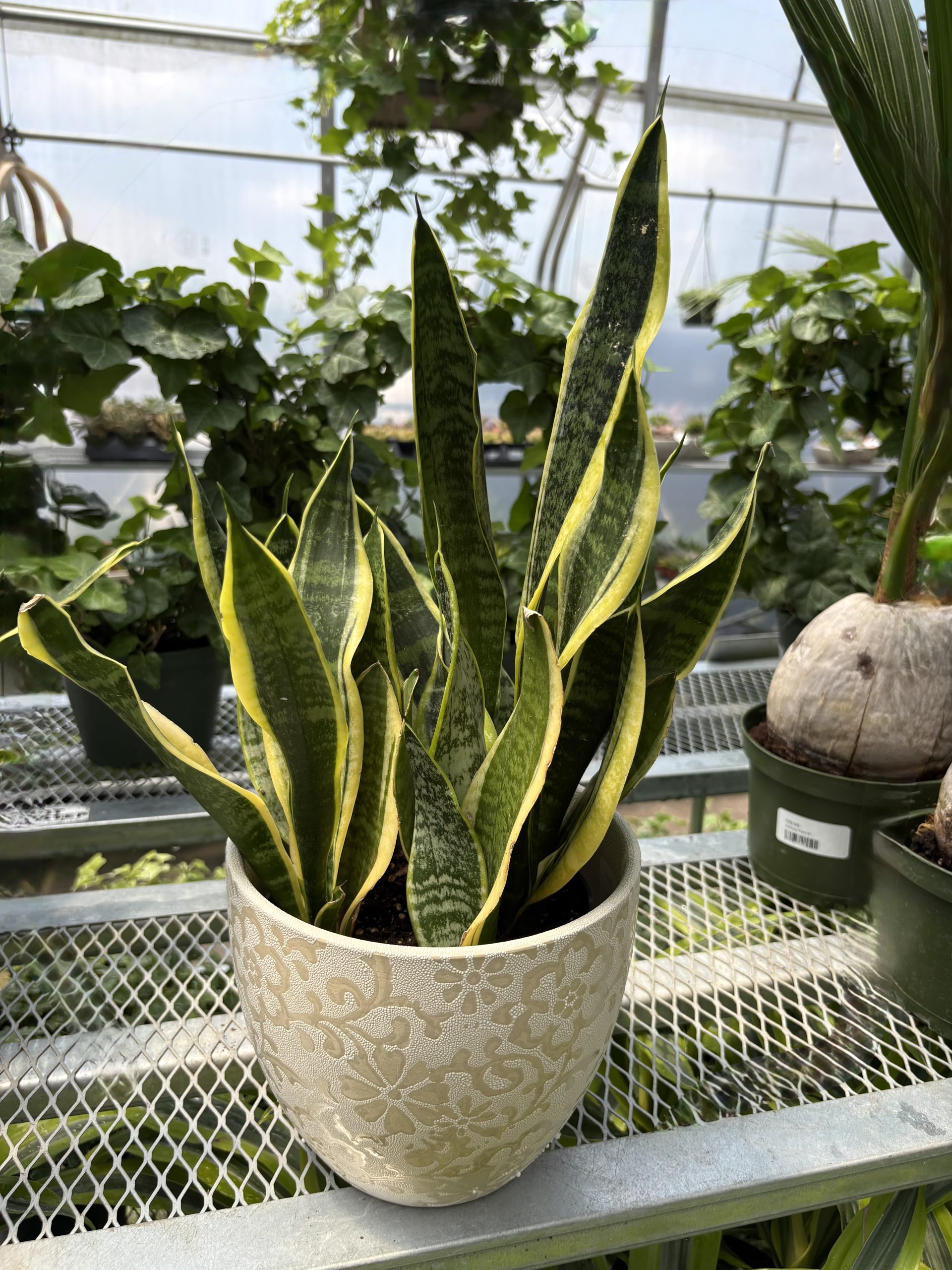 Mother In Law Tongue (Snake Plant) in a Ceramic Container dressed with Spanish Moss.
