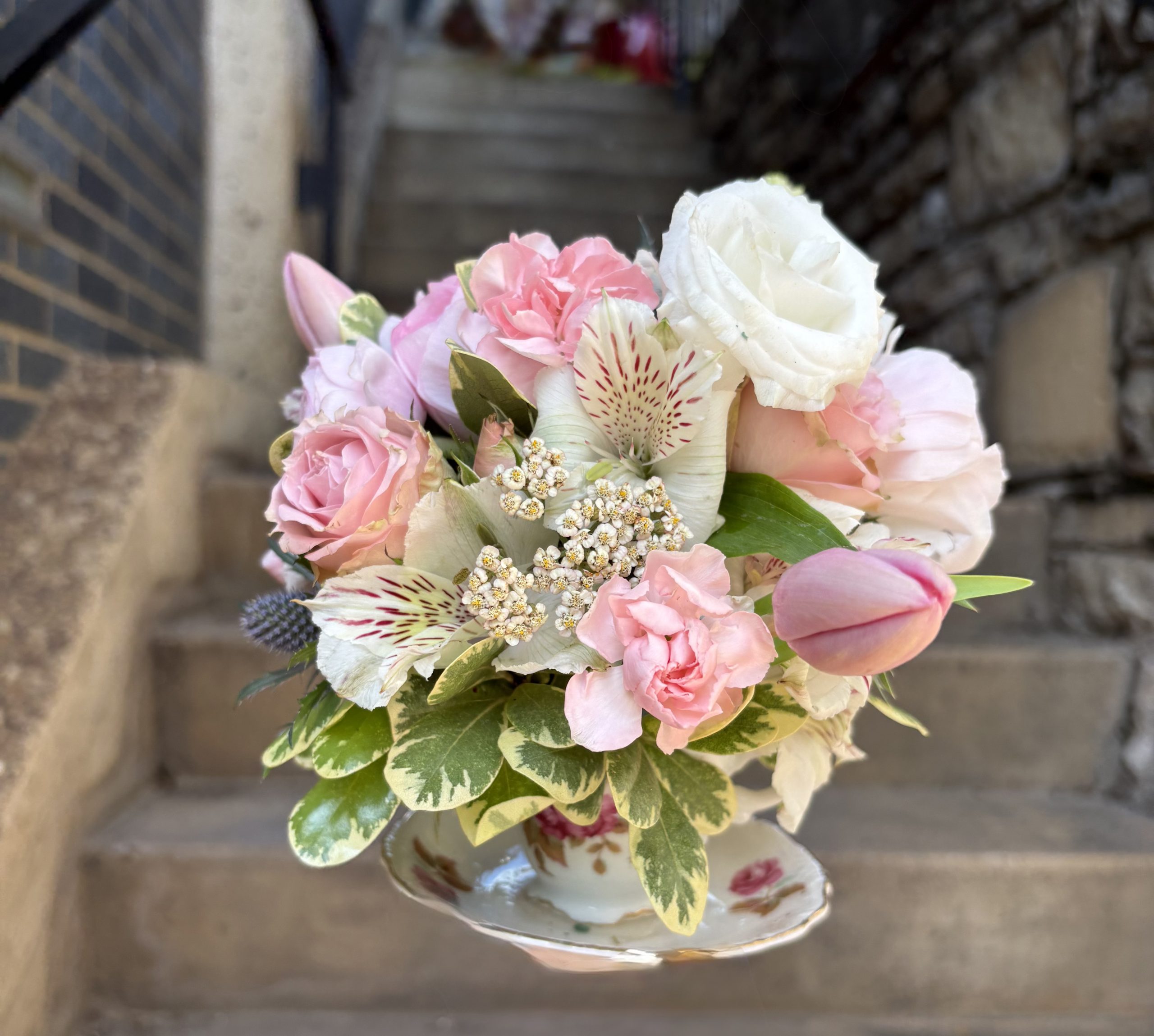 Sweet assorted floral arrangement in a tea cup. Would make a great keepsake gift!